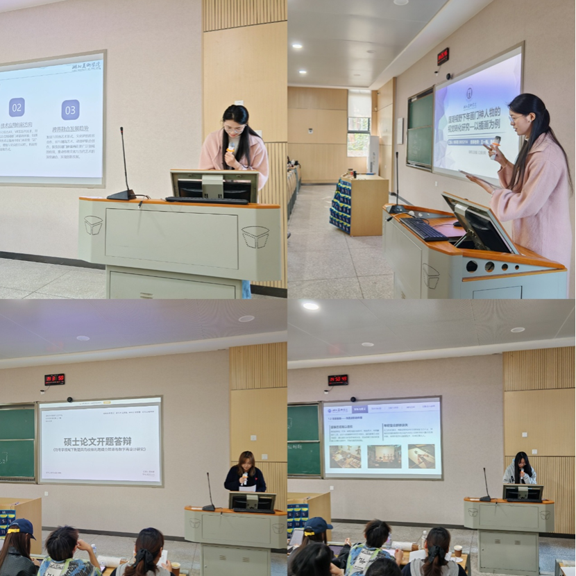 本场讲座特别设置了开题报告模拟答辩环节,并配备了由主持人和2025级艺术设计类硕士研究生组成的五人评审专家团队。第一组开题报告模拟答辩聚焦“非遗的传承与新生”,宋采菲、雷雨晴、饶楠分别从年画门神人物、荆楚凤鸟纹样、陕西皮影中获得设计实践研究的灵感,并结合各自的专业基础与实践方向,探索非物质文化遗产的跨媒介再现和数字化传播。评审专家根据开题报告内容展开提问,答辩人做出回应。主讲人、主持人从标题拟定、选题理由和研究方法等方面进行了讲评。