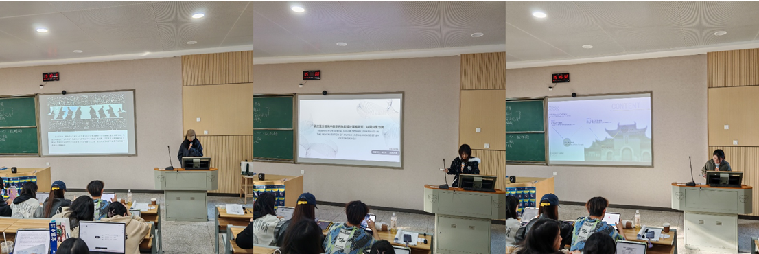 之后上场的潘俊羽围绕南阳汉画馆的汉画像石文创设计应用研究进行了开题陈述,第三组的赵芳萱和张若莹则关注武汉地域文化的现代转译,分别选择同兴里和归元庙会作为研究对象,探讨如何在新时代推动地方文旅融合发展。随后评审专家和现场同学与答辩人进行了交流及互动,主讲人、主持人则结合选题方向、选题内容和选题思路等提出了相应的修改意见。